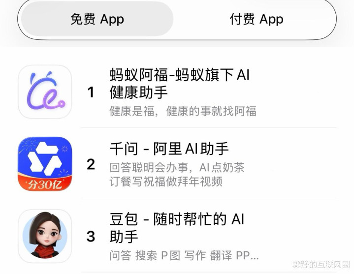 若将这个下载量放在“11.25亿网民范围,80%互联网擢升率”数据下,元宝、千问、蚂蚁阿福的“第又名”含金量如实没那么夸张,然而,需要琢磨两个问题: