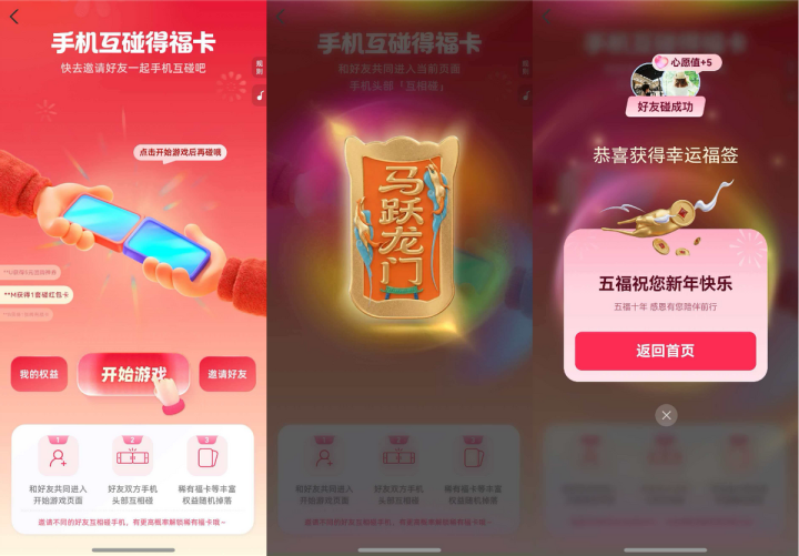 恰逢春节团圆的温馨手艺,碰一下共享福卡功能不错说是精确适配家东谈主聚合的手艺!再也无谓彼此发鸠集,两边翻开支付宝的福卡活动页面——下方心愿聚福——下方好友碰一下,同期参加游戏,然后两台手机轻轻一碰,伴跟着炫酷的殊效,福卡即刻共享,leyu将传统年俗与灵巧体验圆善交融。