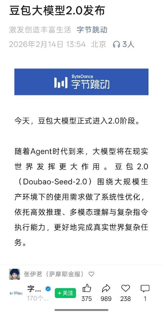 {jz:field.toptypename/}现在,豆包2.0Pro已在豆包App、电脑端和网页版上线,用户遴荐‘众人’阵势即可对话体验;豆包2.0Code接入了AI编程产物TRAE;面向企业和确立者,火山引擎也已上线豆包2.0系列模子API职业。